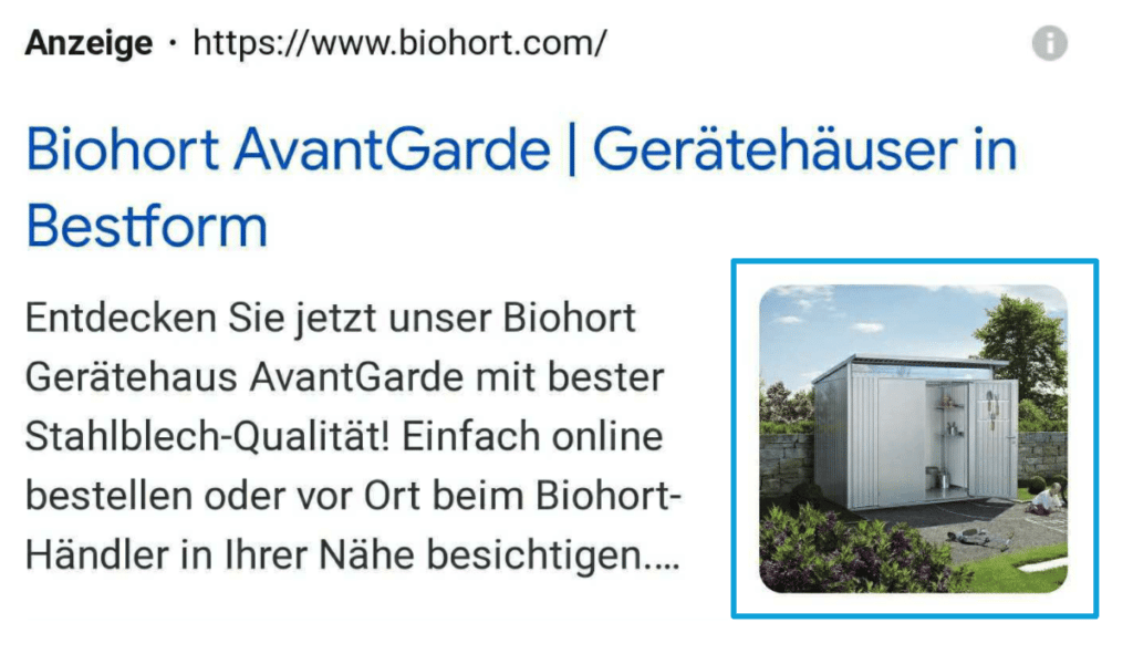 Grundsätzlich vergrößern Bilderweiterungen wieder die Fläche der Anzeige und verdrängen somit den Wettbewerb auf eine niedrigere Platzierung auf der Suchergebnisseite. Wichtig zu erwähnen ist noch, dass Bilderweiterungen derzeit hauptsächlich auf mobilen Geräten ausgespielt werden.