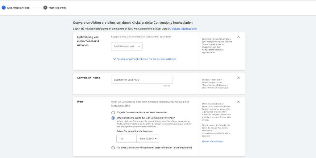 Wichtig ist nun, sich den Namen der Conversion zu merken, da diese nachher im Conversion-Upload erneut benötigt wird. Der Conversion-Wert sollte auf “Unterschiedliche Werte für jede Conversion verwenden” gesetzt werden. Auf diese Weise ist es möglich, dynamische Werte für Leads zu vergeben.