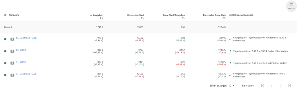 Nehmen wir an, ein Advertiser im B2B-Bereich schaltet getrennte Suchnetzwerk-Kampagnen in Österreich und Deutschland. Je Land gibt es wiederum eine Brand sowie eine generische Kampagne und das Gesamtbudget für die beiden Länder beträgt 1.750 €. Nun stellt sich die Frage, wie das Budget für diese 4 Kampagnen aufgeteilt werden soll.