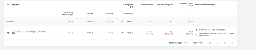 Beide Faktoren zusammen, also die kleine Budgeterhöhung um ca. 90 € sowie die Umverteilung der Budgets zwischen den Kampagnen, sorgen laut Leistungsplan für eine Erhöhung des Conversion-Werts um ca. 575 €. Erneut sieht man auch gut, wie die Budgets der einzelnen Kampagnen angepasst werden müssten, um das Optimum aus den Kampagnen herauszuholen.