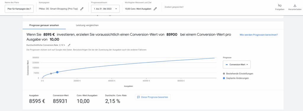 Angenommen, ein Werbetreibender im E-Commerce Bereich möchte wissen, ob er für seine Performance-Max Kampagne sinnvollerweise mehr Budget ausgeben kann. Der ROAS (=Return on Ad Spend) der Kampagne lag im abgelaufenen Monat bei 1.312%, was bedeutet, dass pro eingesetztem Euro 13,12 Euro Umsatz generiert wurden. Nach Berücksichtigung seiner Marge meint er, dass er bereit wäre, auch einen ROAS von 1.000% zu akzeptieren, insofern er dadurch mehr Umsatz erzielen kann. Das ist ein klassischer Fall für den Leistungsplaner.