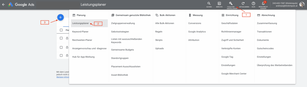 Das Tool kann im Google Ads Interface unter “Tools und Einstellungen > Planung > Leistungsplaner” aufgerufen werden. Mit einem Klick auf das “+”-Zeichen erstellt man einen neuen Plan.