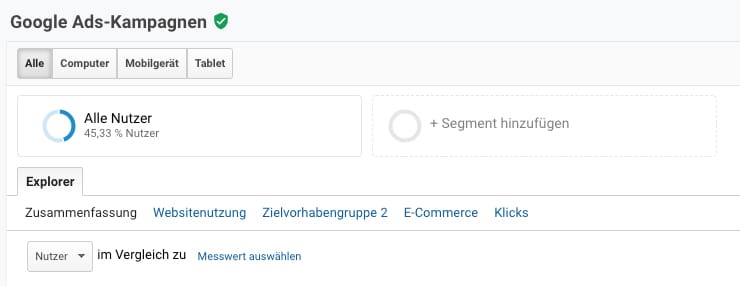 Ab 500.000 Sessions kann es passieren, dass Google Analytics nicht mehr die gesamten Daten zur Analyse heranzieht, sondern nur mehr eine Stichprobe auswertet. Das erkennt man an dem Häkchen neben dem Report-Namen.